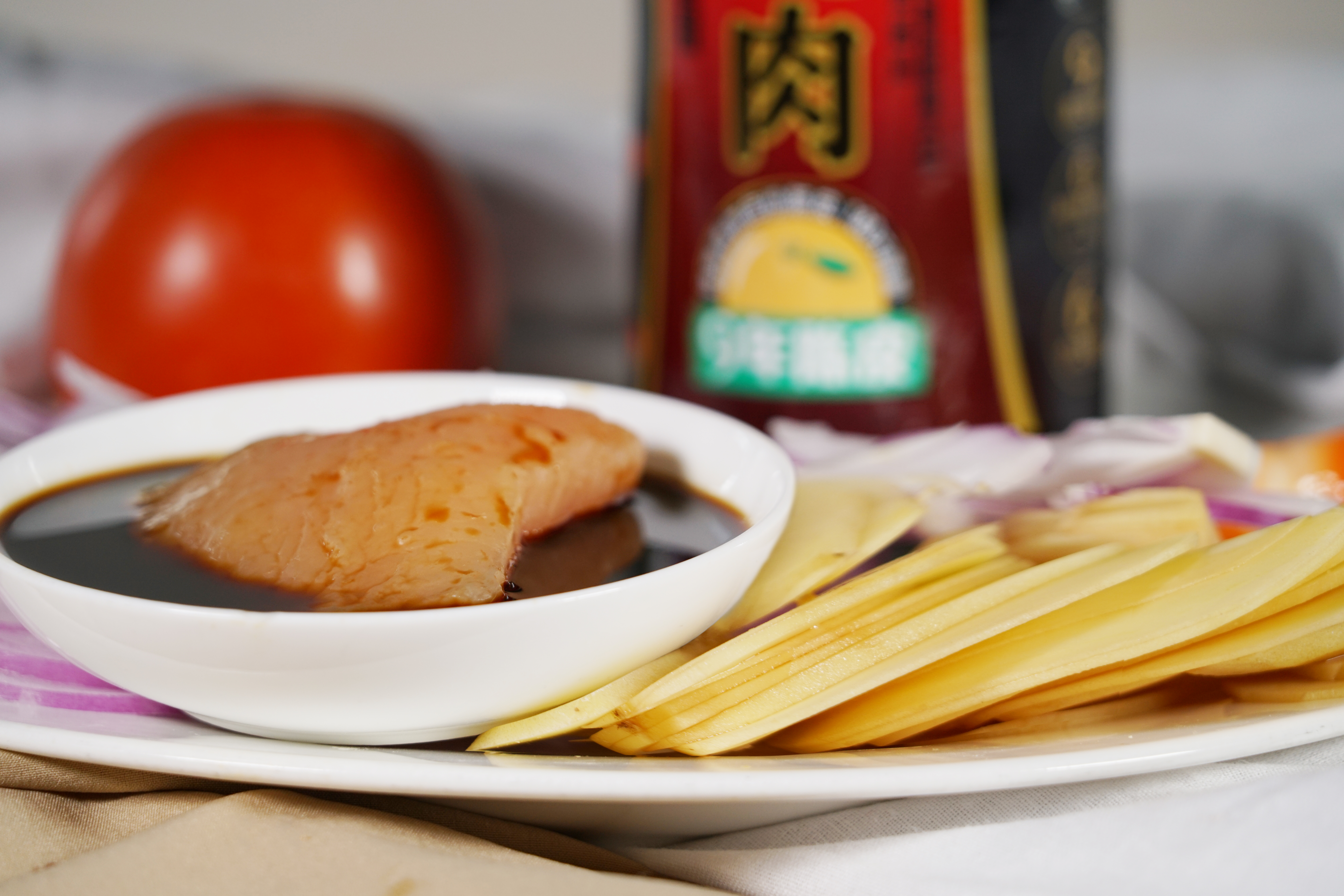 陈皮酱油(蔬菜鲜、红烧肉、蒸鱼汁)是将陈皮拌入酱醪中进行发酵后酿成。在发酵过程中采用多菌种制曲,加速陈皮中糖类、氨基酸、色素、醛类、酮类、酚类等物质的溶出,成品酯类、酚类物质含量丰富。与未加陈皮发酵的酱油相比陈皮酱油黄酮类物质提高31.97%,多酚类物质提高30.76%,产品中挥发性风味物质增加24种。陈皮酱油中氨基酸含量(酱油品级主要指标)达到1.35。