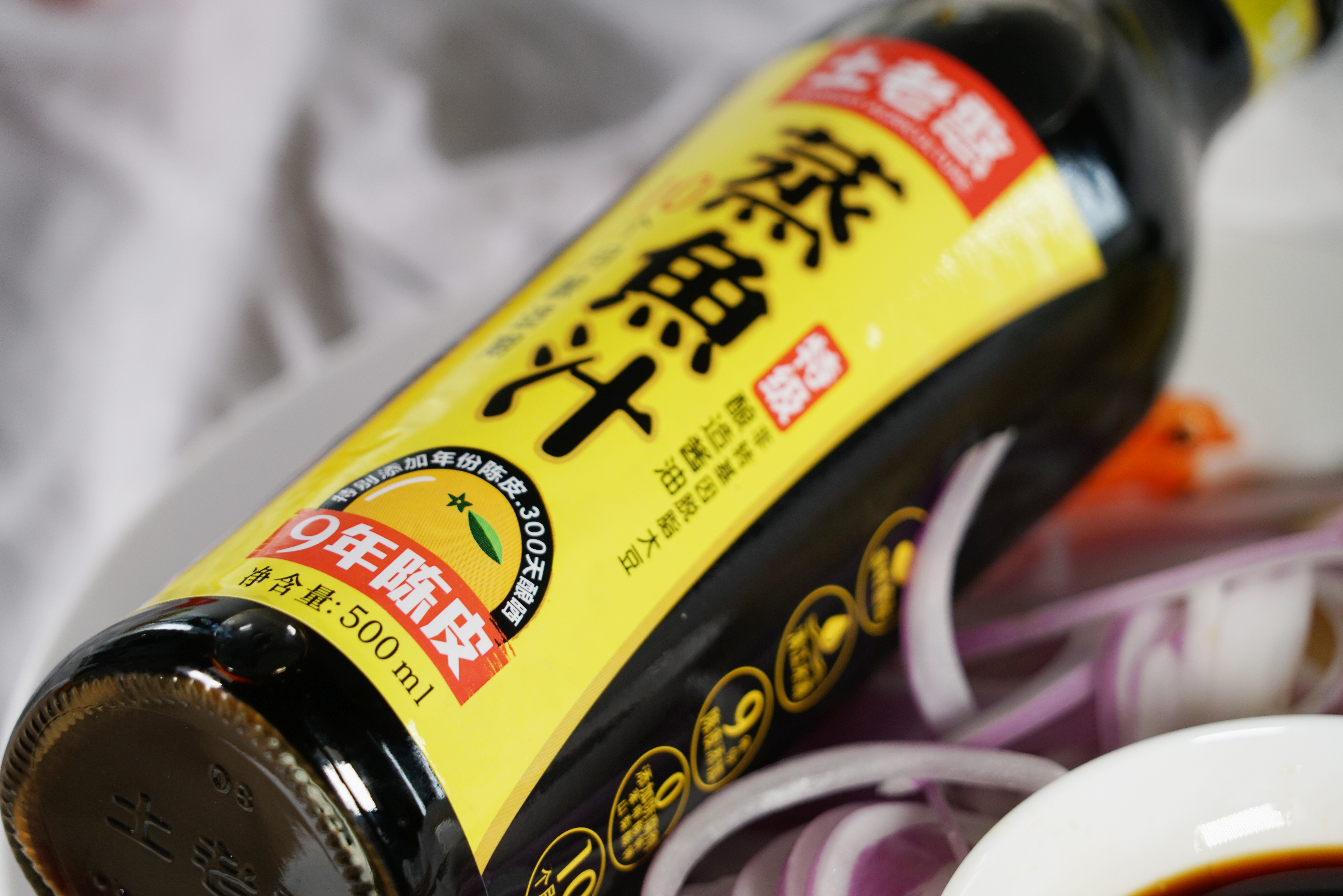 陈皮酱油(蔬菜鲜、红烧肉、蒸鱼汁)是将陈皮拌入酱醪中进行发酵后酿成。在发酵过程中采用多菌种制曲,加速陈皮中糖类、氨基酸、色素、醛类、酮类、酚类等物质的溶出,成品酯类、酚类物质含量丰富。与未加陈皮发酵的酱油相比陈皮酱油黄酮类物质提高31.97%,多酚类物质提高30.76%,产品中挥发性风味物质增加24种。陈皮酱油中氨基酸含量(酱油品级主要指标)达到1.35。