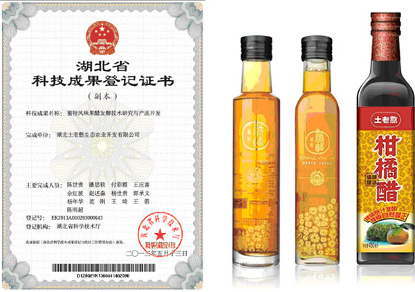 柑橘果醋以蜜柑为主要原料,辅以少量大米(添加量5%),先将大米经过糊化、液化等工序加工后与蜜柑汁以一定比例混合采用液态深层发酵工艺进行发酵而成。以低价的大米来替代食糖,不但降低生产成本,而且产品质量在营养和风味上也更突出。发酵过程中采用多菌种发酵技术比单一菌种发酵的酒精度高出1.8-2.3度,从自然发酵的蜜柑醋醪和醋液中筛选出一株产酸量高、产酸稳定性较强的醋酸菌T-7,发酵总酸含量最高可达7.76g/100mL,与酿造食醋的醋酸菌相比,在醋酸转化速率和产品风味上均有很大的提高。目前主要开发了柑橘调味醋和橘醋原浆2个产品,今后将逐步开发保健型的橘醋饮料。该项研究取得1项科技成果。